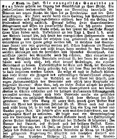 Kray, 14. Juli. Die evangelische Gemeinde zu Kray feierte gestern die Legung des Grundsteins zu ihrer Kirche. Die Festteilnehmer