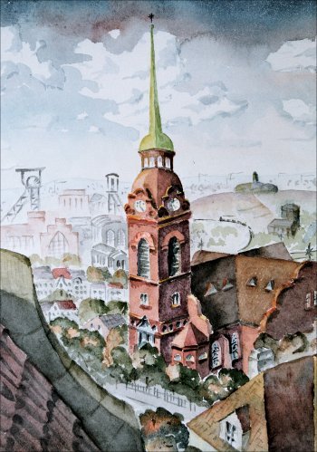 Aquarell von J. C. Bückner 1947: Kray, Blick vom Rathausturm (Ausschnitt)